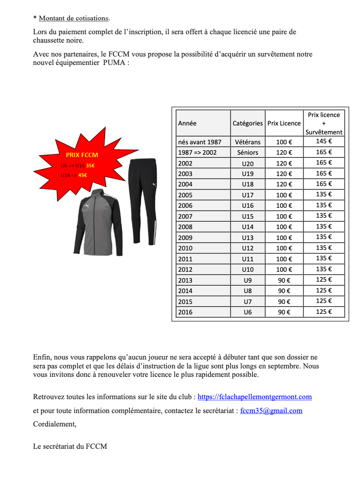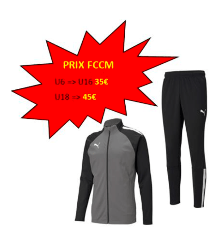 * Montant des cotisations : Lors du paiement complet de l’inscription, il sera offert à chaque licencié une paire de chaussettes noires. Avec nos partenaires, le FCCM vous propose la possibilité d’acquérir un survêtement de notre nouvel équipementier PUMA