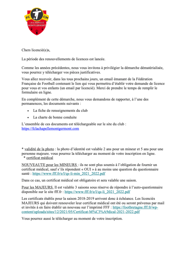 * certificat médical NOUVEAUTE pour les MINEURS : ils ne sont plus soumis à l’obligation de fournir un certificat médical, sauf s’ils répondent « OUI » à au moins une question du questionnaire santé : https://www.fff.fr/e/l/qs-li-min_2021_2022.pdf