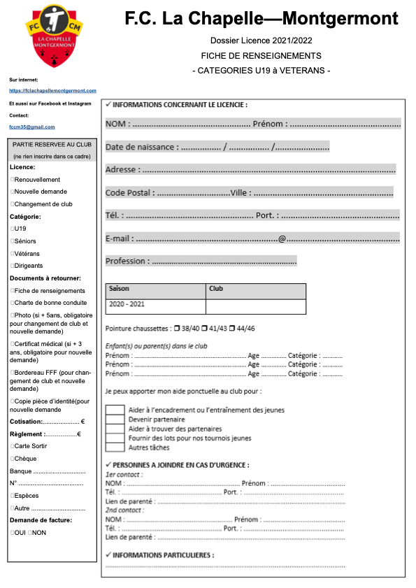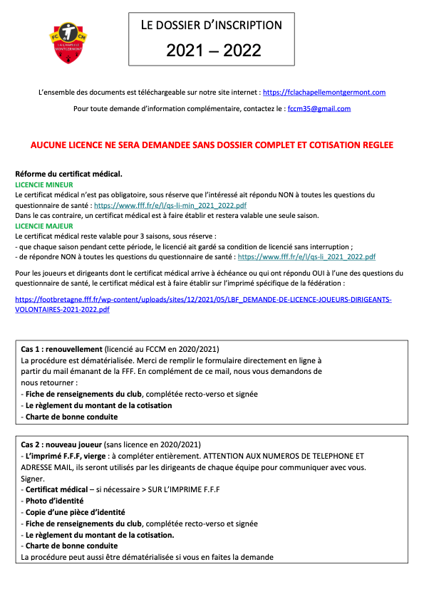 Retrouvez toutes les informations sur le site du club : https://fclachapellemontgermont.com et pour toute information complémentaire, contactez le secrétariat : fccm35@gmail.com